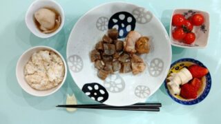 recipe 今夜のメニュー *鶏とコンニャクの照り焼き あとは里芋煮たのとか、プチトマト、バナナといちご、玄米入りご飯 鳥照りにコンニャク入れて焼いてみた(DELISH KITCHENで見た)中々いい感じ。カロリーも抑えられるし、なんせお安い!