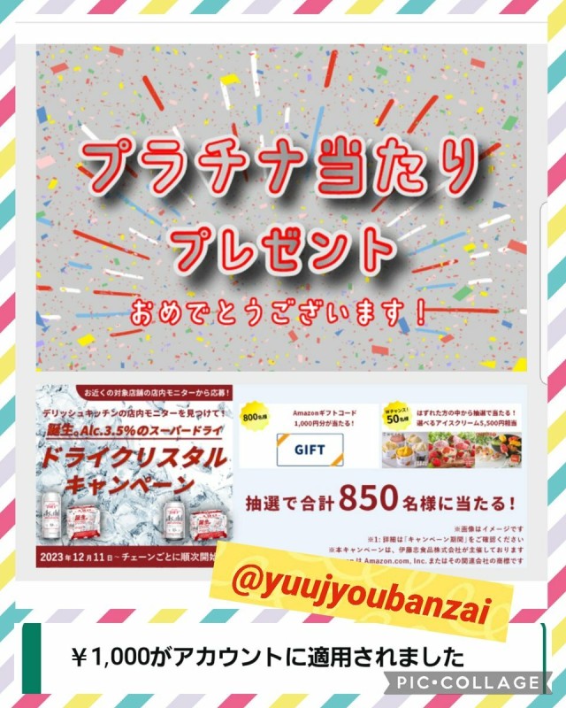 【X外】 DELISH KITCHEN デリッシュキッチン様() 店内モニターを見つけて!ドライクリスタルキャンペーンAmazonギフト1,000円分当選いただいてました!?❤️ よく行くスーパー対象だったのですが定期的にキャンペーンされてますので気になる方是非??