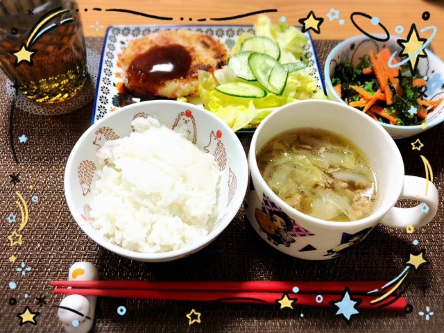 今回のメニューは、DELISH KITCHEN作のロコモコ丼、しめじと鮭のガーリックバター炒め、かいわれとツナのサラダ、キャベツとベーコンのスープ、まるみキッチン作の濃厚ホワイトチョコテリーヌを作ってみました? いい出来映えです?