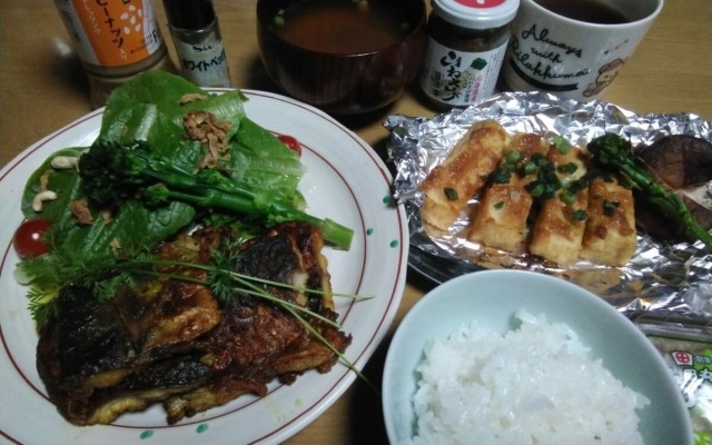 今日のお家夜ご飯は、クラシルレシピを参考に、サバのカレーソテー♪鯖は酒大1をふり10分。水気をふき小麦粉、カレー粉を混ぜまぶし両面焼く。ワンプレートで、ロメインレタスとカシューナッツのサラダ♪を添えて。デリッシュキッチンレシピを参考に、厚揚げの味噌にんにく焼き♪白米♪他(o^-^o)
